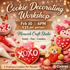 Celebrate Valentine’s Day with a sweet, hands-on cookie decorating workshop! Each guest will receive 6 large cookies to decorate, with icing and sprinkles provided. Perfect for friends, couples, or anyone looking to add a little love and creativity to their Valentine’s celebration. We are collaborating with Cookies & Cupcakes by Design