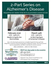 Join us for educational presentations on healthy living for the brain and body, along with an overview of the 10 warning signs of Alzheimer’s disease. You’ll learn practical tips for staying healthy, and when to seek help for memory concerns.