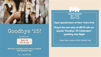 Join us 12-4 PM (all locations) on New Year’s Eve for our “Goodbye to ’25” Celebration Flight = three Michigan sparklers for just $9 (regularly $12!).